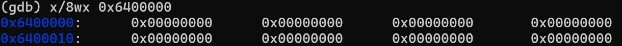 ์ดํ x/8wx ๋ฉ๋ชจ๋ฆฌ ์ฃผ์ ๋ช ๋ น์ ์ ๋ ฅํ๋ค. ์ด ๋ช ๋ น์ ์ ๋ ฅ๋ ๋ฉ๋ชจ๋ฆฌ ์ฃผ์๋ถํฐ 8๊ฐ๋ฅผ 4๋ฐ์ดํธ์ฉ 16์ง์๋ก ๊ฐ์ ์ถ๋ ฅํ๋ผ๋ ๋ช ๋ น์ด๋ค. ๊ทธ๋์ 0x6400000 ๋ฉ๋ชจ๋ฆฌ ์ฃผ์์ ๊ฐ์ 4๋ฐ์ดํธ์ฉ 8๊ฐ ์ถ๋ ฅ์ํ๋ค. ์ถ๋ ฅ ๊ฐ์ 4๊ฐ ๋์จ๋ค.