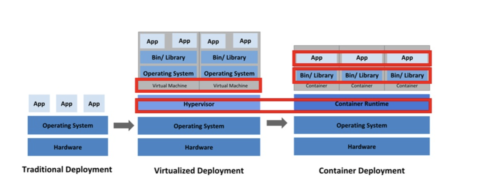 맨 왼쪽의 Traditional Deployment(전통적 배포)는 가상화 이전부터 사용되던 방식입니다. 물리적인 컴퓨터 한 대에 하나의 운영체제를 설치하고, 그 위에 여러 가지 프로그램을 설치하는 방식입니다. 이는 가장 오래되고 단순한 방식으로, 단일 목적의 시스템이라면 충분히 효과적일 수 있습니다.